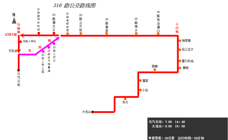由公汽公司始發(fā),途經(jīng)公園路、建設(shè)街東風(fēng)路/遼河大街、遼河大街、營大路、上白線、營口東站路口、柳樹鎮(zhèn),終點到達(dá)大龍山